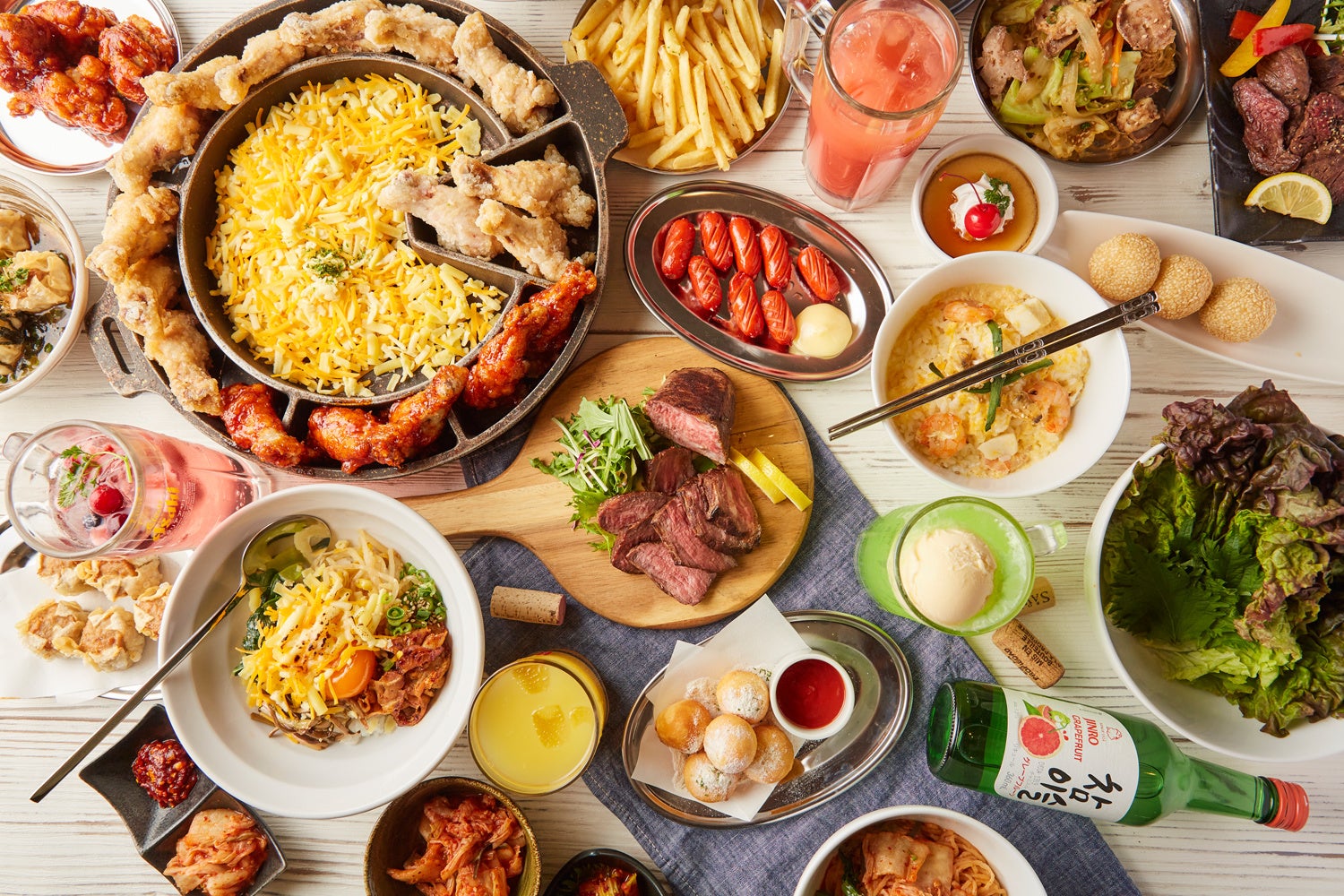 居酒屋メニューや韓国料理60品、牛ステーキなど豊富なメニューをガッツリ楽しめる充実プラン