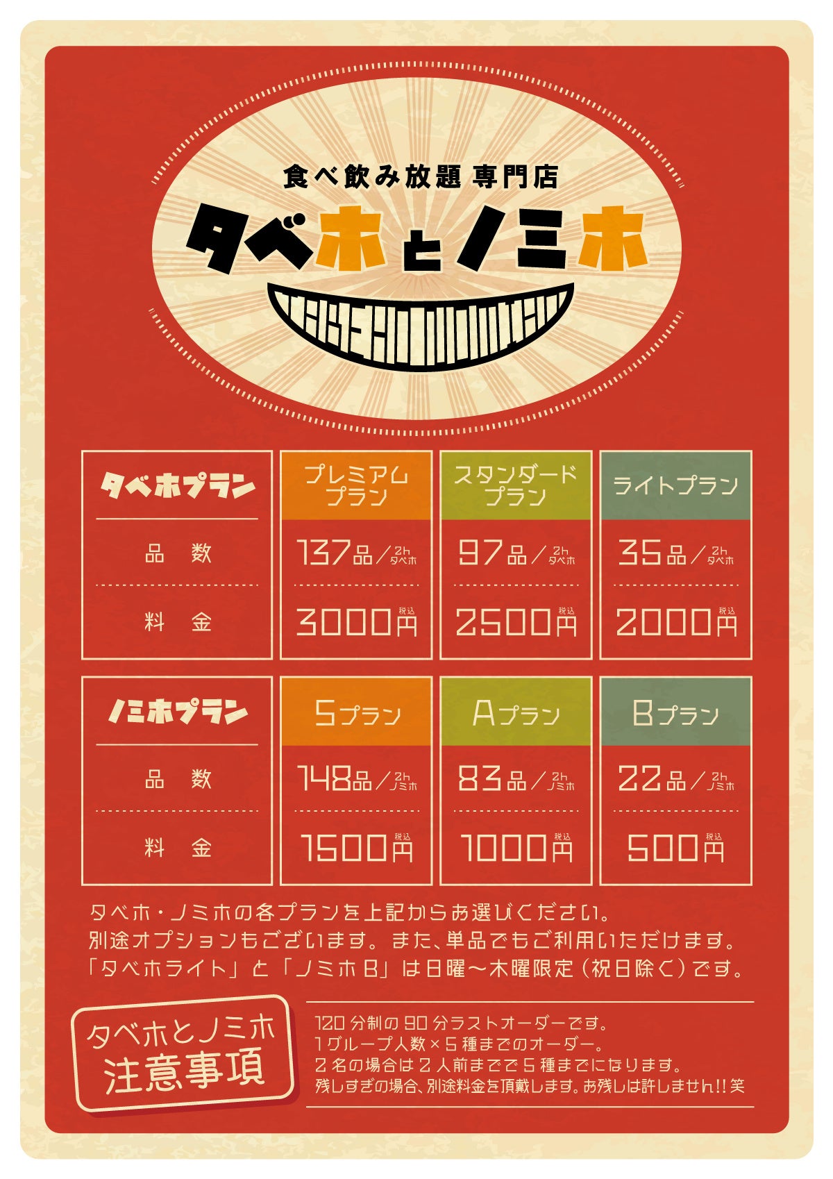 ・食べ放題、飲み放題ともに120分制となります。(ラストオーダーは90分となります。)