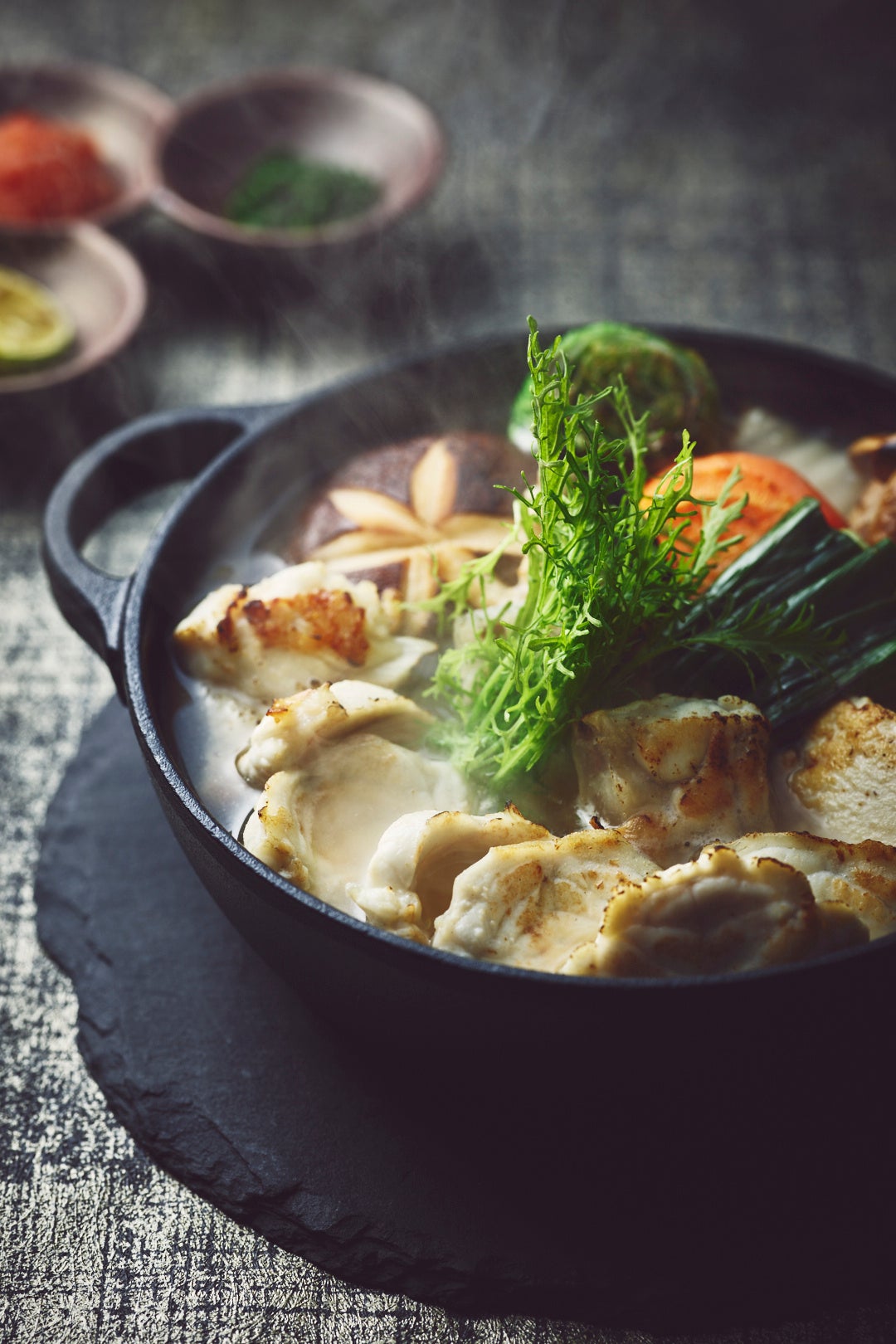 長崎は松浦・九十九島から取り寄せたとらふぐと京人参、丹波しめじ、九条ねぎに、白菜、木綿豆腐など滋味あふれる食材を彩り鮮やかに添えました。〆には雑炊がお薦め。余すことなくふぐの旨味を最後まで享受いただけます。