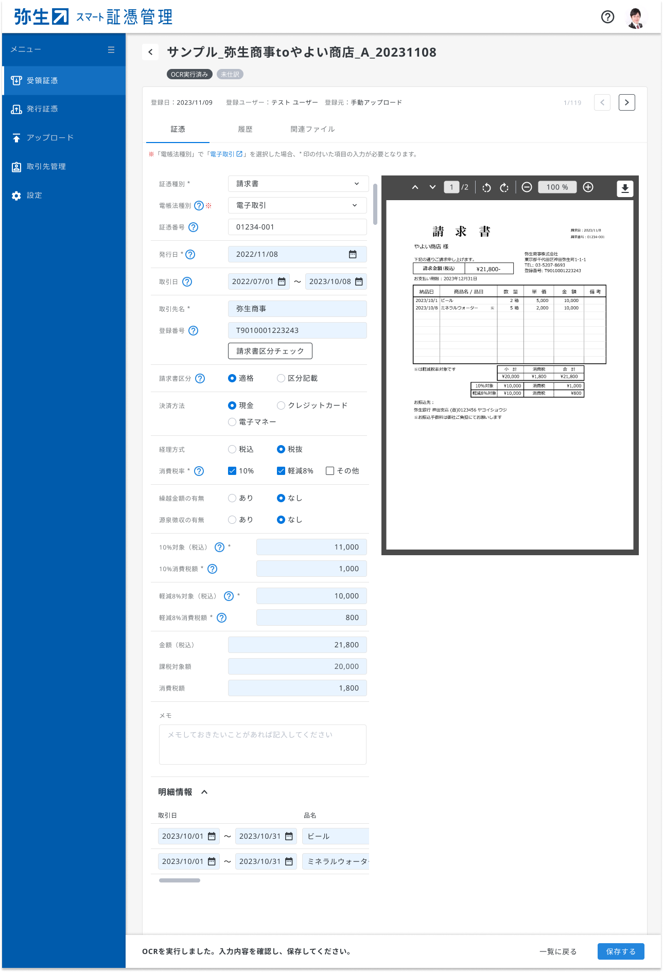 「スマート証憑管理」はインボイス制度と電子帳簿保存法における法令改正への対応と、デジタル化による業務効率化の両方を実現します。今年10月から始まるインボイス制度は、消費税の仕入税額控除の金額を正しく計算するための制度です。会計業務で対応する際の大きな流れは、証憑を受け取った後にそれが適格請求書であるか、そうでないかの判断を行うこと、その次に仕訳作業を行うことです。しかしながら、一連の作業を人の目で複数項目、複数回行うことは効率が悪く、ミス発生の確率が高くなります。「スマート証憑管理」では、搭載するAI-OCRによりアップロードした証憑の文字情報の自動読み取り※3を実現、「弥生シリーズ」と合わせて利用することにより仕訳情報を連携できるようになります。