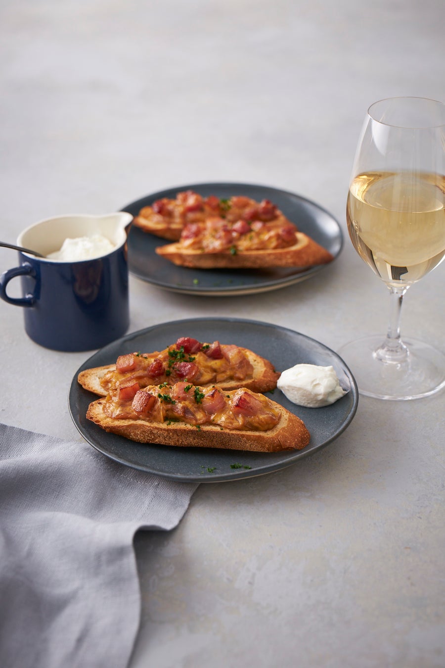 ①「明治ブルガリアヨーグルトLB81プレーン HOME MADE STORY」を 1食当たり100g使用(水切り後50g) ② カットしたライ麦パンの上にハラペーニョとアボカドを混ぜたワカモレ、濃厚な味わいの当該品を贅沢に水切りしたヨーグルトソース、黄身がとろけるエッグジャム(半熟卵)を乗せ、最後にレモンオイルであえたワイルドルッコラと、たっぷりのグラナパダーノチーズを削りかけた一品。 |