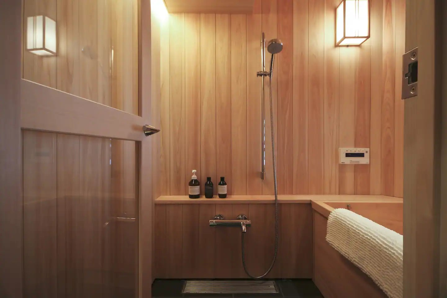 都心型ブランドホテルのスイートと同じサイズのお部屋にクイーンサイズのベッド、大型TVとミニキッチンを配したリビングルーム、そして自慢の檜材を使ったお風呂とで構成されています。東京駅に出入りする新幹線を眺めながら、湯船に浸かってみたり、銀座で買い物や食事をした後、たった徒歩5分でお部屋に戻れたり、質の高い内装デザインと、ホテルにはない利便性を兼ね備えたお部屋です。