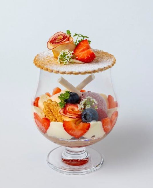 バラの形にしたりんごをトッピングするなど、華やかで可愛らしい庭園をイメージ。甘酸っぱいラズベリーアイスと クリーミーで口溶けのよいバニラアイスに、やさしい甘さを持つクリームがマッチした魅惑の一品です。