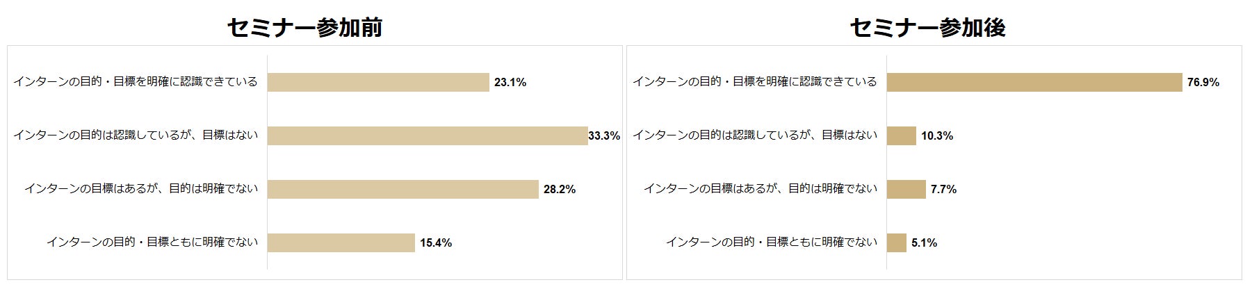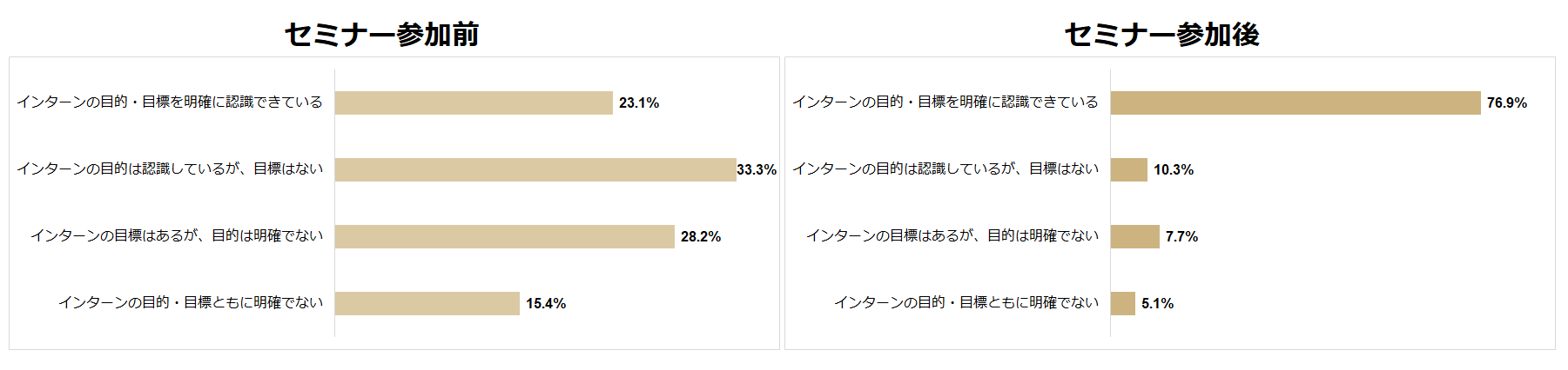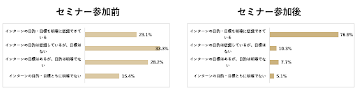 インターンの目的について、セミナー参加前は「目的・目標を明確に認識できている」が23.1%だったが、参加後は76.9%となった。