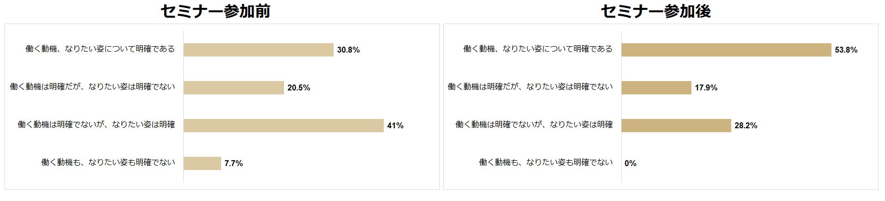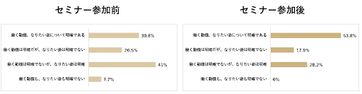 働く動機、なりたい姿について、セミナー参加前は「明確でない」が7.7%だったが、参加後は0%に。セミナー後、参加者の半数以上が「働く動機、なりたい姿について明確である」と回答した。