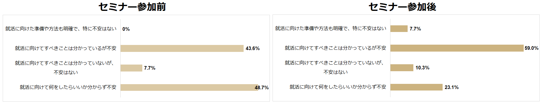 就職活動に関して、セミナー参加前は「何をしたらいいかわからず不安」が48.7%だったが、参加後は23.1%に。セミナー参加後、就職活動に向けてすべきことが明確になったと感じている学生が約70%となった。