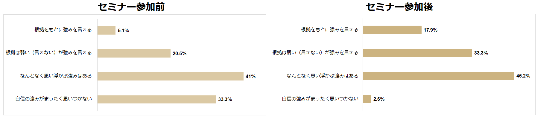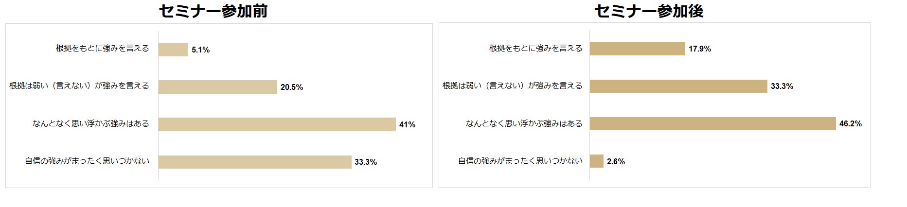自身の強みに関して、セミナー参加前は「全く思いつかない」が33.3%だったが、参加後はわずか2.6%になった。また、「強みを言える、思い浮かぶ強みがある」との回答が97.4%となった。