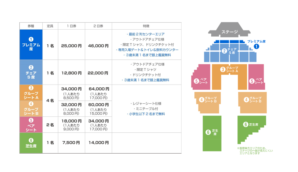 客席前方には専用特典が盛りだくさんのプレミアム席、ご家族・ご友人とゆったり楽しめるグループシートなど、さまざまな楽しみ方ができるチケットを用意しております。