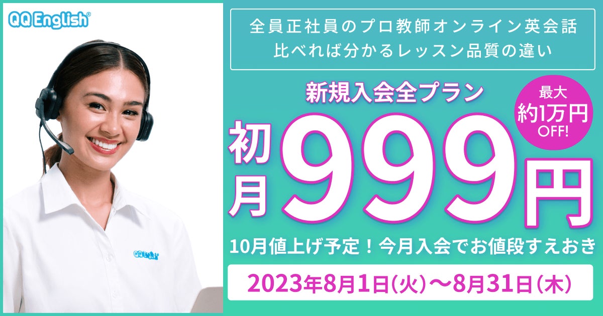 QQEnglishでは、この夏に英語学習をスタートされる皆さまを応援する「新規入会 全プラン初月999円キャンペーン」を実施いたします。