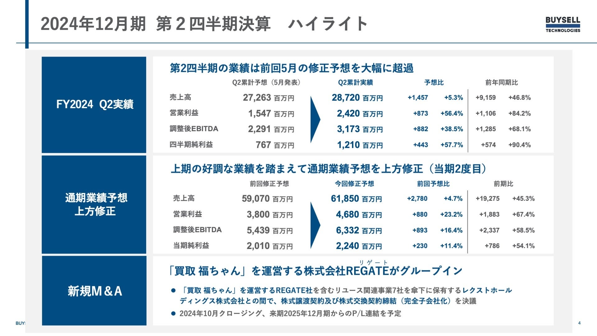バイセル、通期業績予想を今期2度目の上方修正 新規M&Aを発表しグループ戦略を前進【2024年12月期 第2四半期決算】