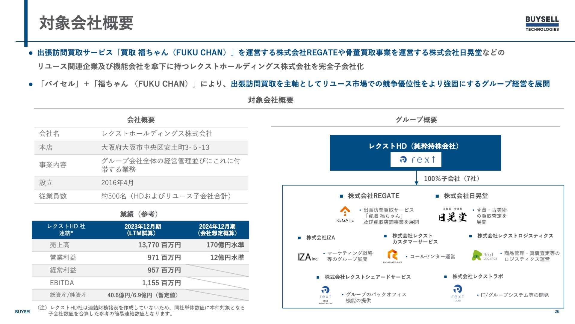 出張訪問買取事業サービス「買取 福ちゃん」を運営する株式会社REGATE、骨董買取事業「日晃堂」を運営する株式会社日晃堂のほか、リユース関連事業及び機能会社全7社を傘下に持つレクストホールディングス株式会社を完全子会社化いたします。