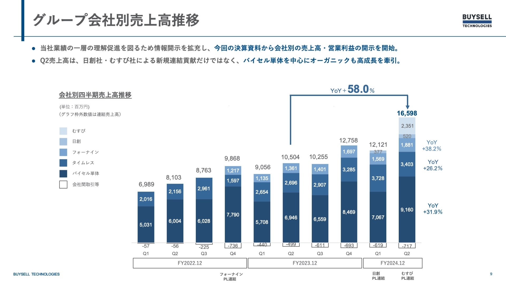 今期第1四半期より日創社、第2四半期よりむすび社をP/L連結しています。これらの新規連結貢献だけではなく、バイセル単体を中心とする既存グループ企業も大きく成長し、第2四半期売上高は前年同期比+58.0%の成長となりました。