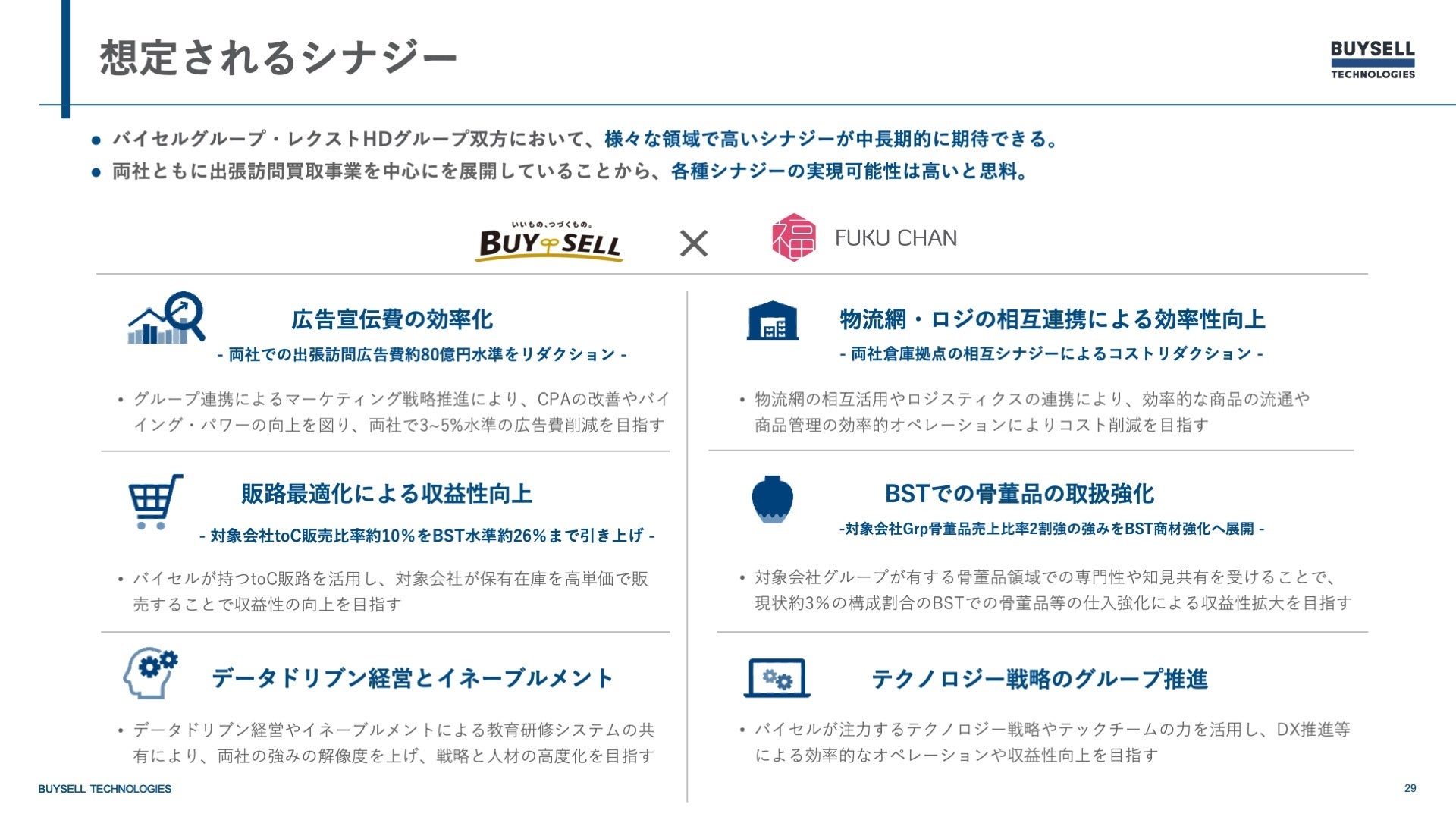 本M&Aにより、広告宣伝費の効率化、物流網・ロジスティクスの効率性向上、販路最適化、テクノロジー戦略のグループ推進など、広い領域での高いシナジーが中長期的に期待できます。