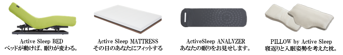 ベッドは平らであるという常識を捨て、個々人にあわせた眠りやすい角度、「入眠角度」を提案する「Active Sleep BED」をはじめ、スマートフォンのリモコンで自由に寝心地が調整できる「寝心地コントロール」を実現した「Active Sleep MATRSS」、毎日の眠りを解析する高性能センサーを搭載した「Active Sleep ANALYZER」などのラインナップを取り揃えています。