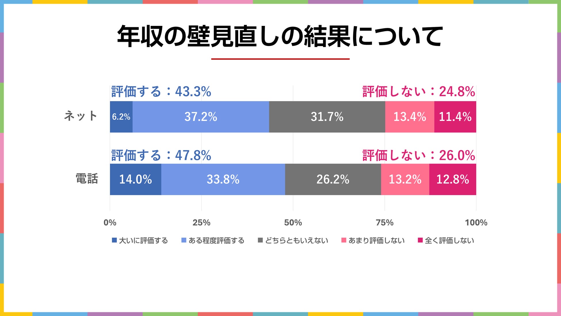 「『年収103万円の壁』の見直しでは、課税最低額を160万円に引き上げることが決まりました。あなたは、年収の壁見直しの結果を評価しますか?」と聞いた結果が上の図です。