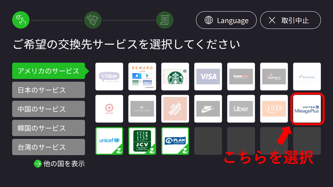 ① スタートボタン選択後に表示される交換先サービスの中から「マイレージプラス」のロゴを選択。