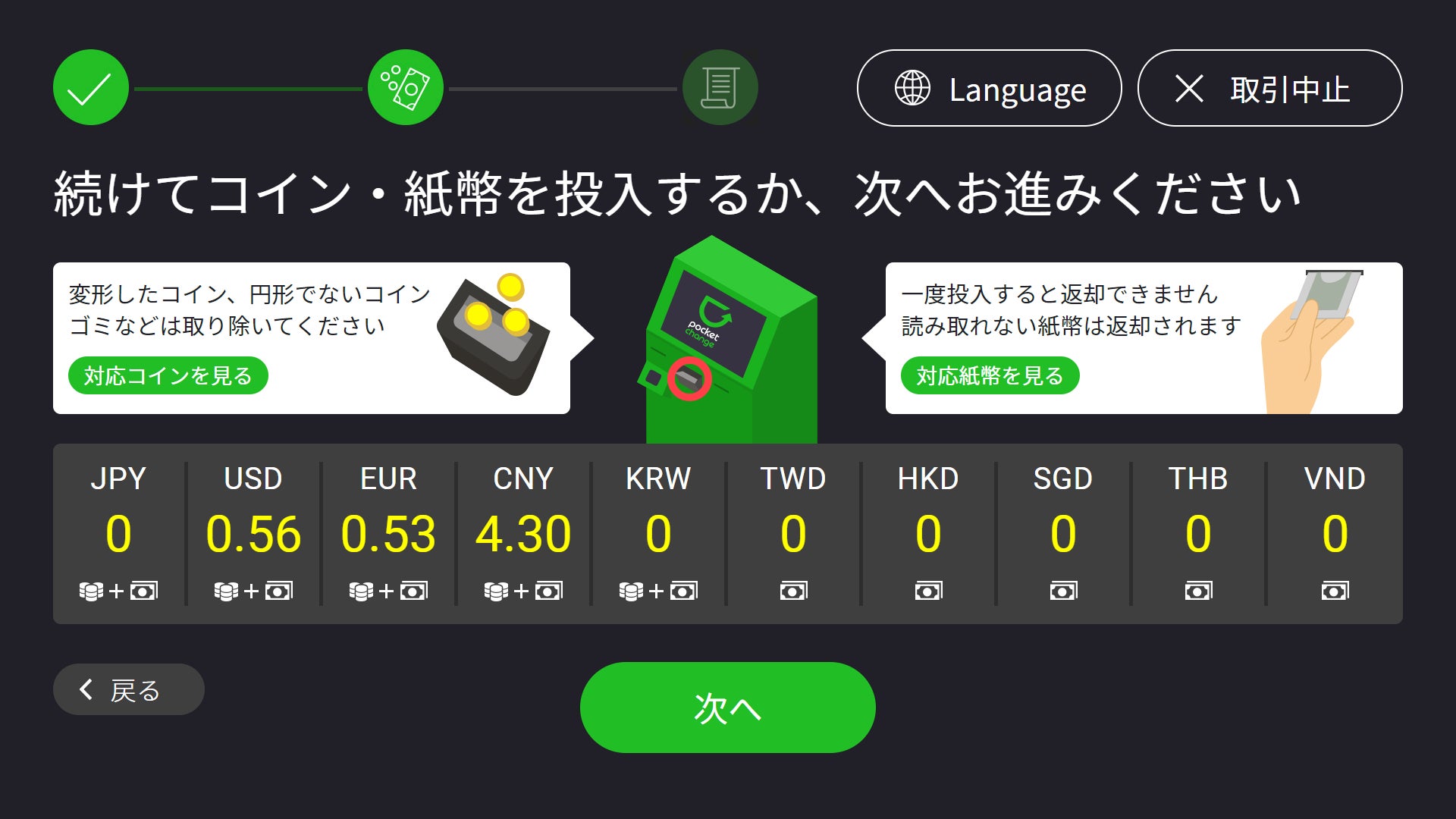 対応通貨は日本円を含む全10通貨で、そのうち4通貨(米ドル・ユーロ・中国元・韓国ウォン)は硬貨にも対応しております。