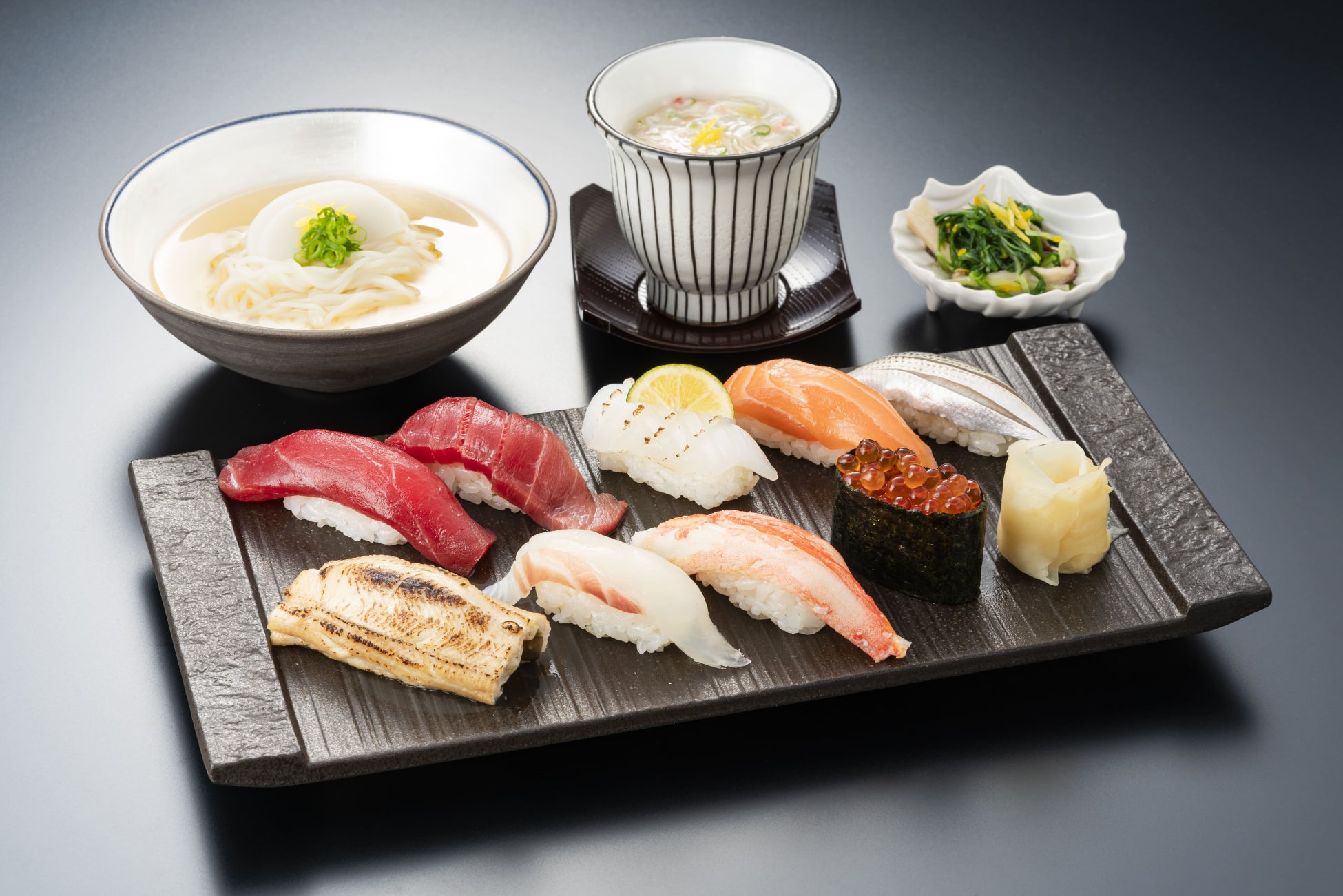 季節の食材と繊細な調理法が織り成す千両自慢の鮨御膳。 前菜、椀物、焼物、蒸し物、天ぷら、そして絶品の鮨をご堪能ください。