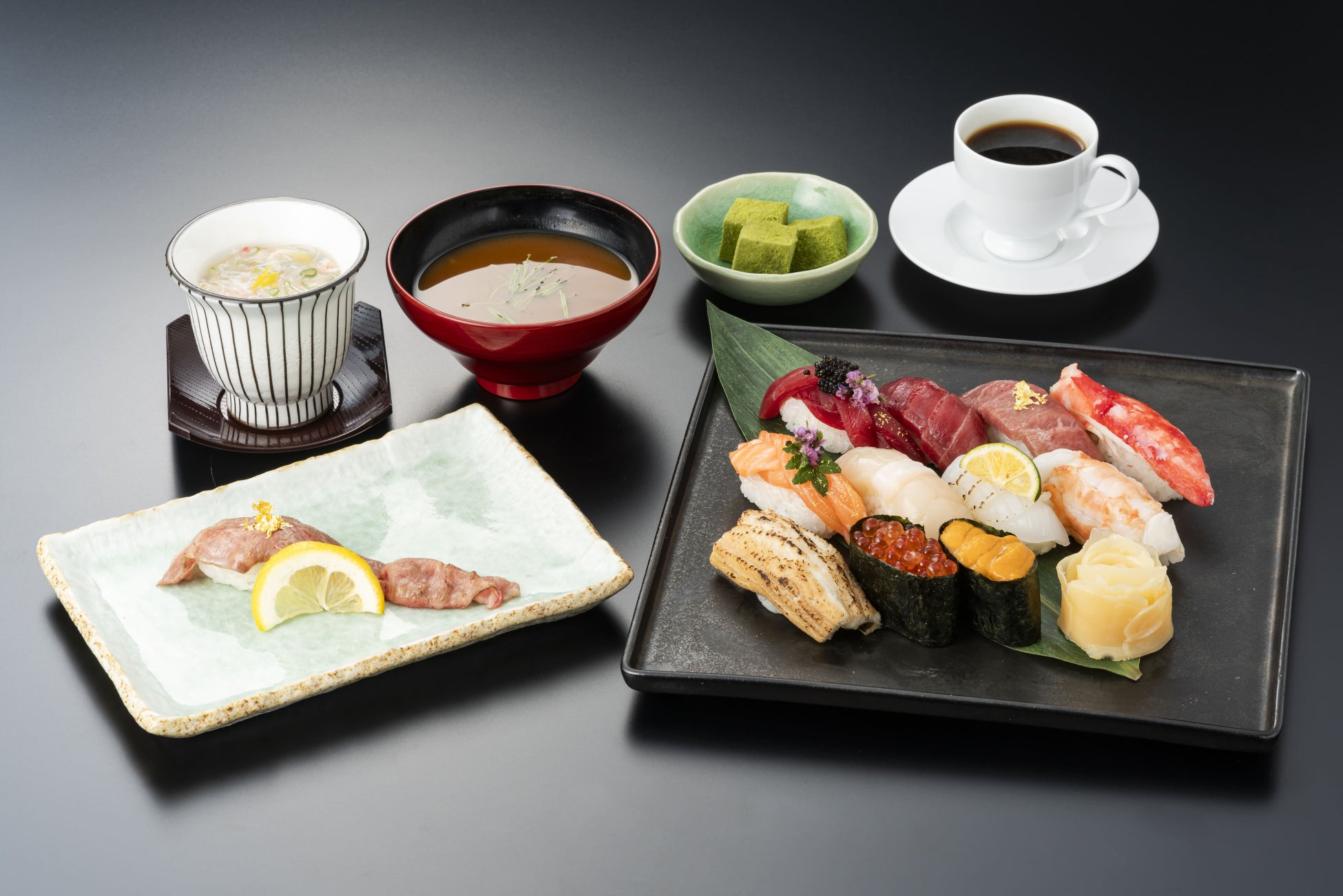 鮨の数が多く、本セットでしか食べられない肉鮨つきのコースです。デザートの和スイーツはコーヒーと一緒にお召し上がりください。