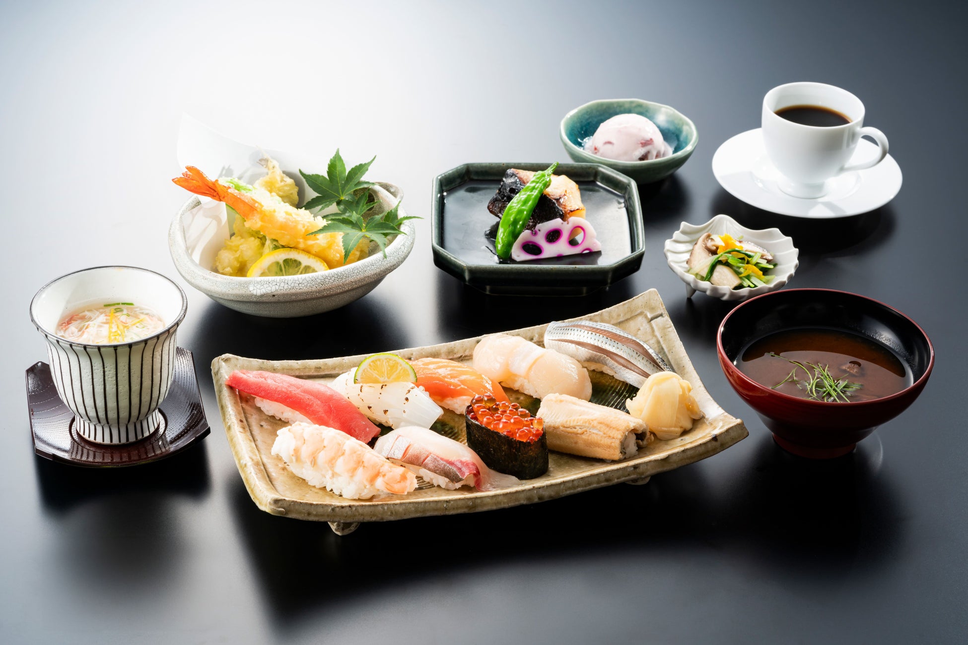 焼き物や天ぷら、鮨にデザート・ドリンクまでついた満足感たっぷりの贅沢御膳。