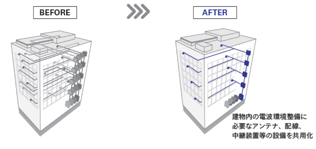 延床面積1万㎡を超えるような大型の建物では、屋内の携帯電波の環境整備を施す必要性が高くなります。屋内の電波環境整備にインフラシェアリングを活用することで、不動産事業者にとっては省スペース化・電気代の削減・窓口の一本化、携帯キャリアにとっては、設備投資・運用費用の削減、携帯ユーザーにとっては、通信環境の改善による満足度向上などのメリットを提供することができます。