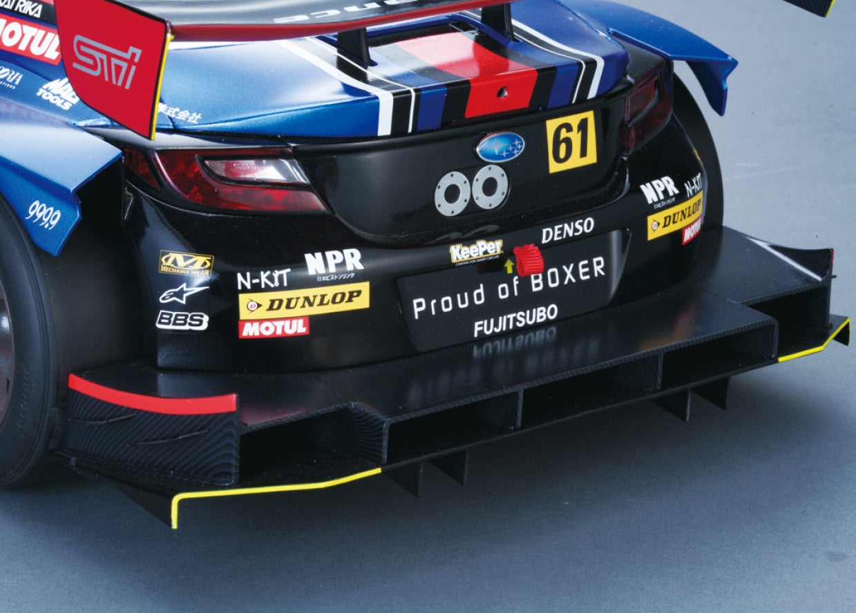 リアスカートは大きく後ろ側に張り出しワイドな設計。下面に設けられたディフューザーを含め、空力を計算し尽くした形状を徹底再現。