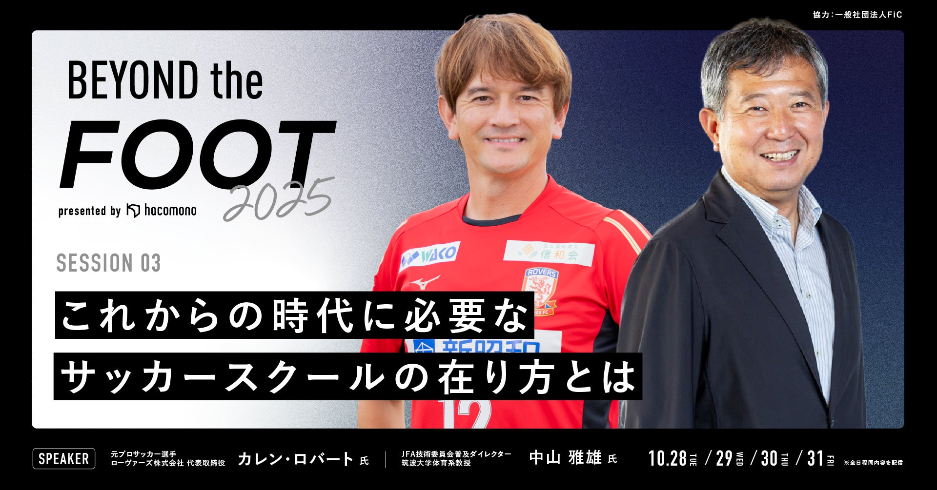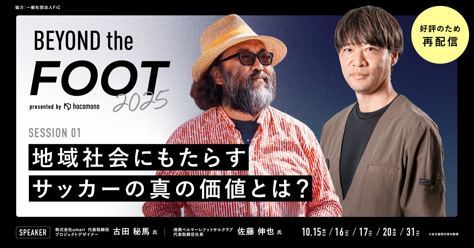 株式会社hacomono(本社:東京都渋谷区、代表取締役CEO:蓮田健一)は、サッカークラブ・スクール運営者や教育関係者を対象にしたオンラインカンファレンス「BEYOND the FOOT 2025」を、2025年10月15日(水)から31日(金)まで開催いたします。
