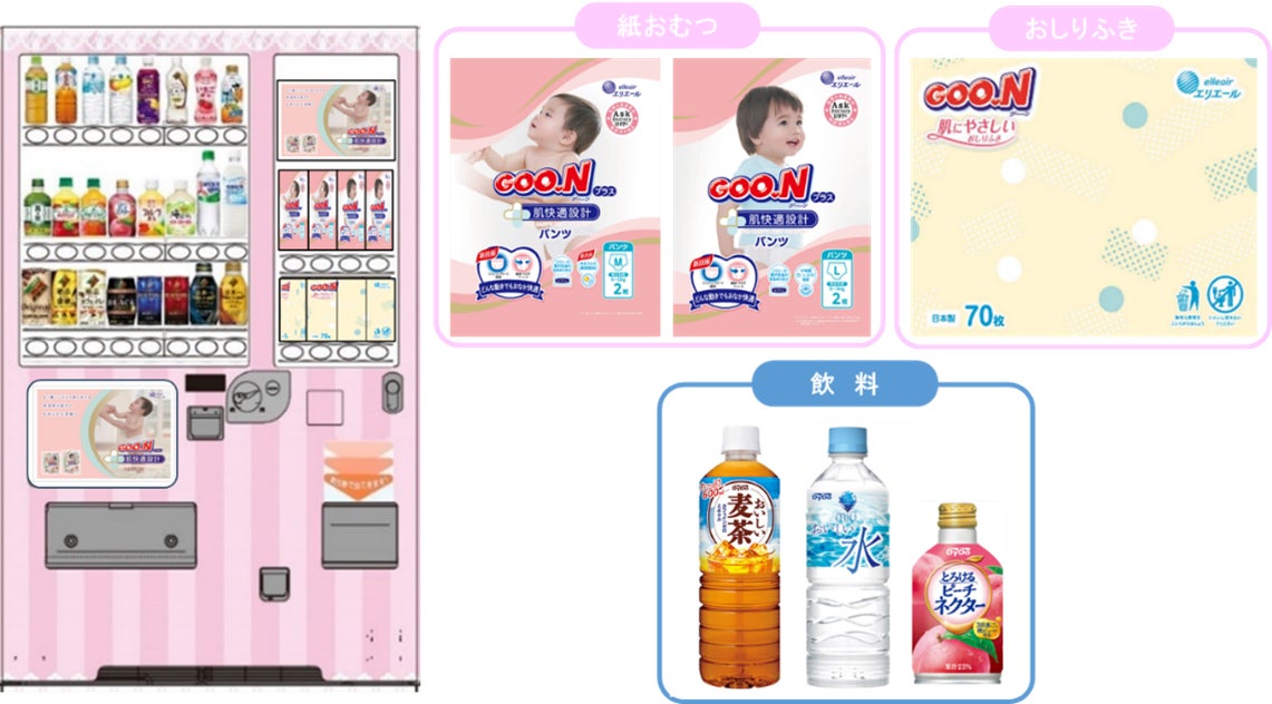 本自販機は、子育てしやすい環境づくりを進めている同町に対して、自動販売機を通じて貢献できればと企画したもので、飲料とともに、ベビー用 紙おむつの小パック(2 枚入り)やおしりふきシートを購入することができます。