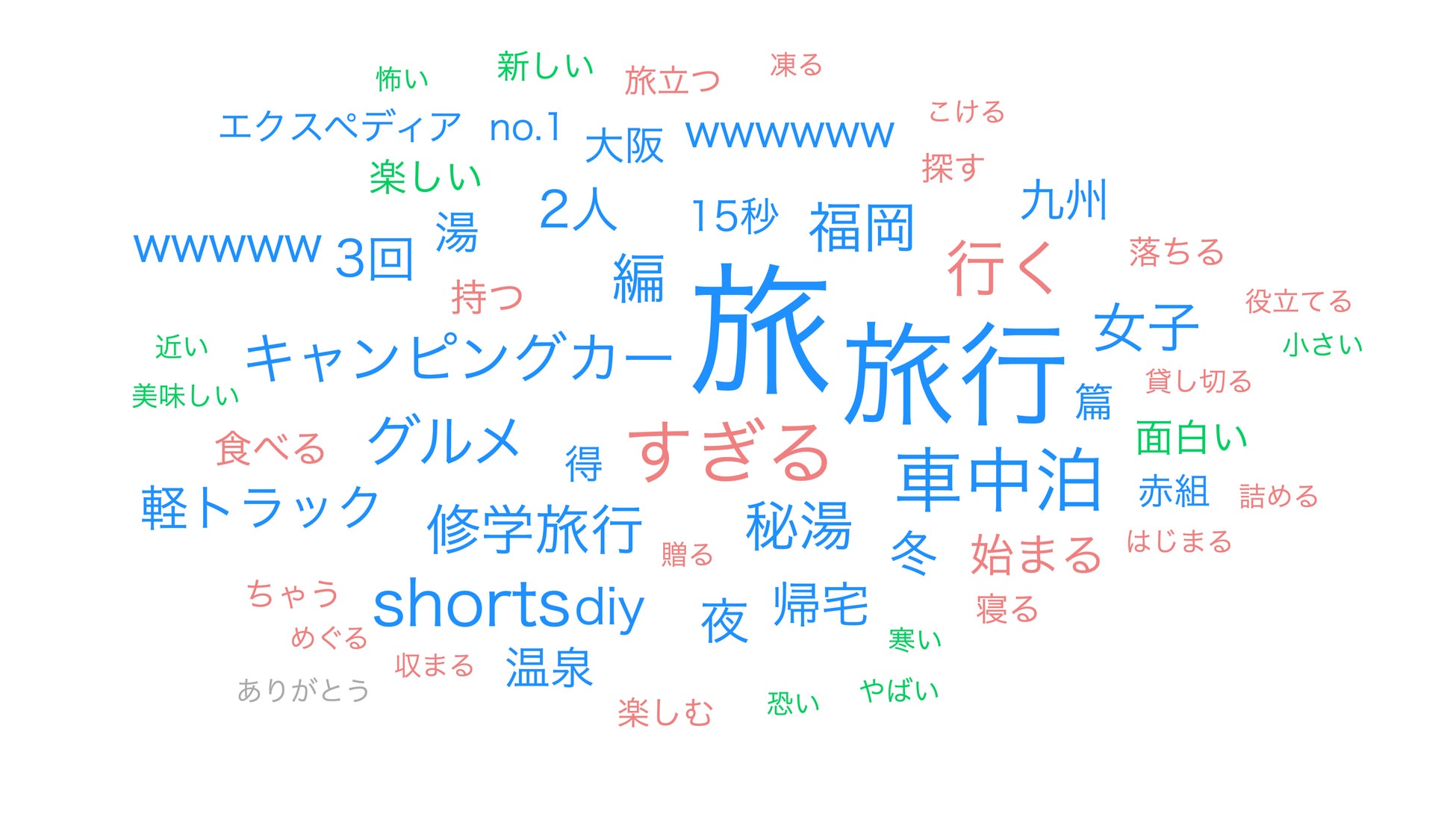 2021年3月〜現在に至るまでのYouTube上の動画タイトルで出現回数の多い単語を抽出すると、キャンピングカーや軽トラックなどの大型車を活用する車中泊動画が多いことが見て取れます。
