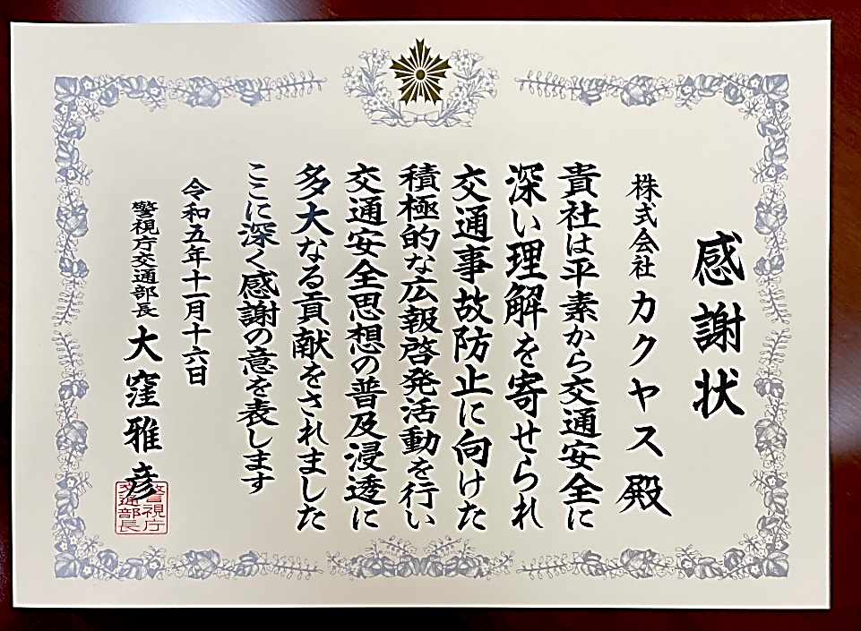 この度、当社の交通事故防止に向けた広報啓発活動など日々の活動が評価され、2023年11月16日(木)、警視庁「令和5年秋の交通功労者等表彰式」にて警視庁交通部長より「特別優良団体」として、感謝状を授与されました。