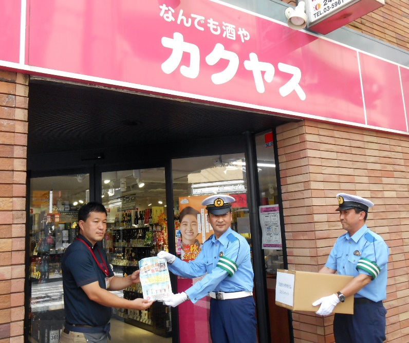 (なんでも酒やカクヤス 巣鴨駅前店にて、巣鴨警察署交通課長より当社従業員へ交通安全啓発活動への協力依頼をいただいている様子)