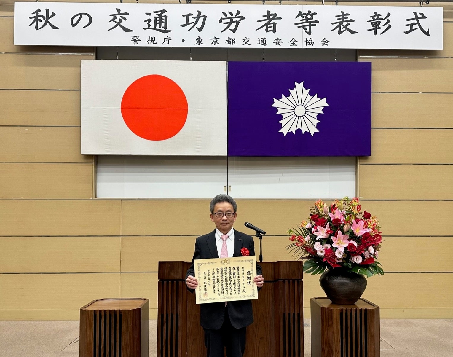 「秋の交通功労者等表彰式」は、永年に渡り交通安全に尽力している個人や団体に対し、警視総監、警視庁交通部長、東京都交通安全協会長より、感謝状を贈呈する表彰式です。警視庁新橋庁舎にて執り行われ、当社代表取締役社長の佐藤順一が出席しました。