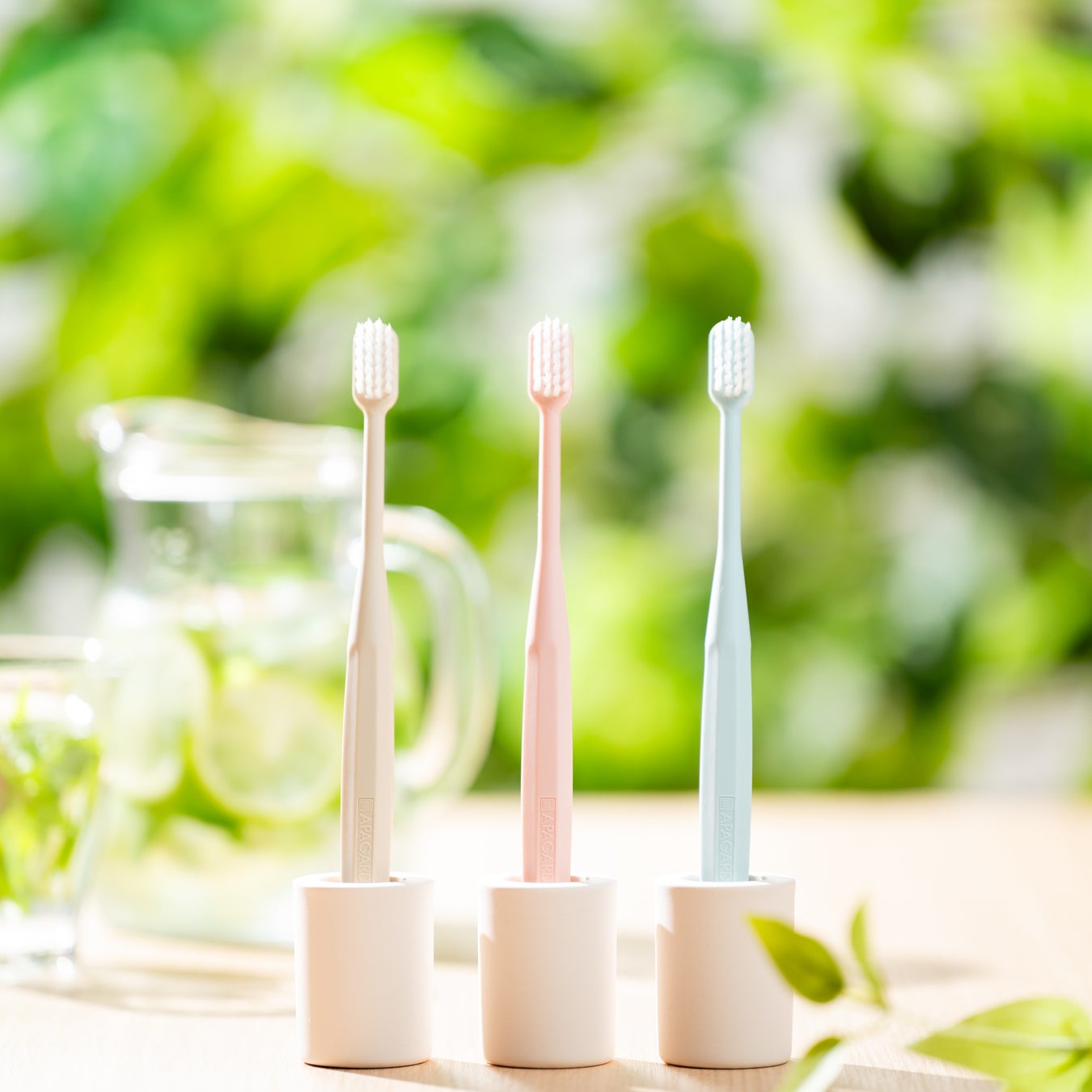 こうした背景からアパガードは環境への取り組みの第一歩として、2022年に「アパガードプレミオトラベルセット eco」と、替え用歯ブラシで携帯用にハンドルが短いショートサイズの「アパガードeco歯ブラシS」を展開しました。そして今回、より多くの方が日常的に使っていただけるよう、通常サイズの「アパガードeco歯ブラシ」を新発売します。本製品のハンドル部分の材質は、炭酸カルシウムを主原料とすることで、プラスチック使用量を51%以上*削減。カラーは素材そのものの色を表す「きなり」と可憐な「さくら」に加え、柔らかな青みを帯びた「あさぎ」を新しく追加した全3色です。シンプルながらも洗練された色合いに仕上げ、ライフスタイルに溶け込む美しさを追求しました。