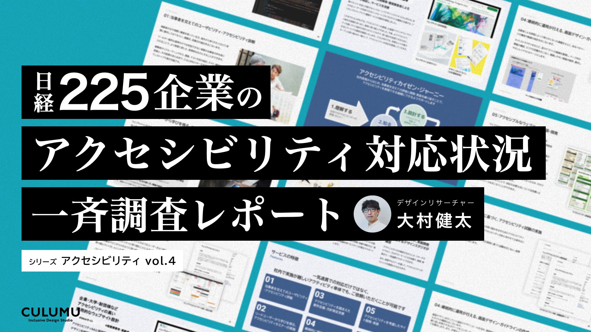 株式会社STYZ(東京都渋谷区、田中辰也 代表取締役社長)が運営するインクルーシブデザインスタジオCULUMU(くるむ)では、2024年4月1日から事業者による障害のある人への合理的配慮の提供が義務化され、企業からの問い合わせをいただく機会が増えたことから、日経225企業のwebアクセシビリティ対応状況をリサーチし、一斉調査レポートを公開しました。