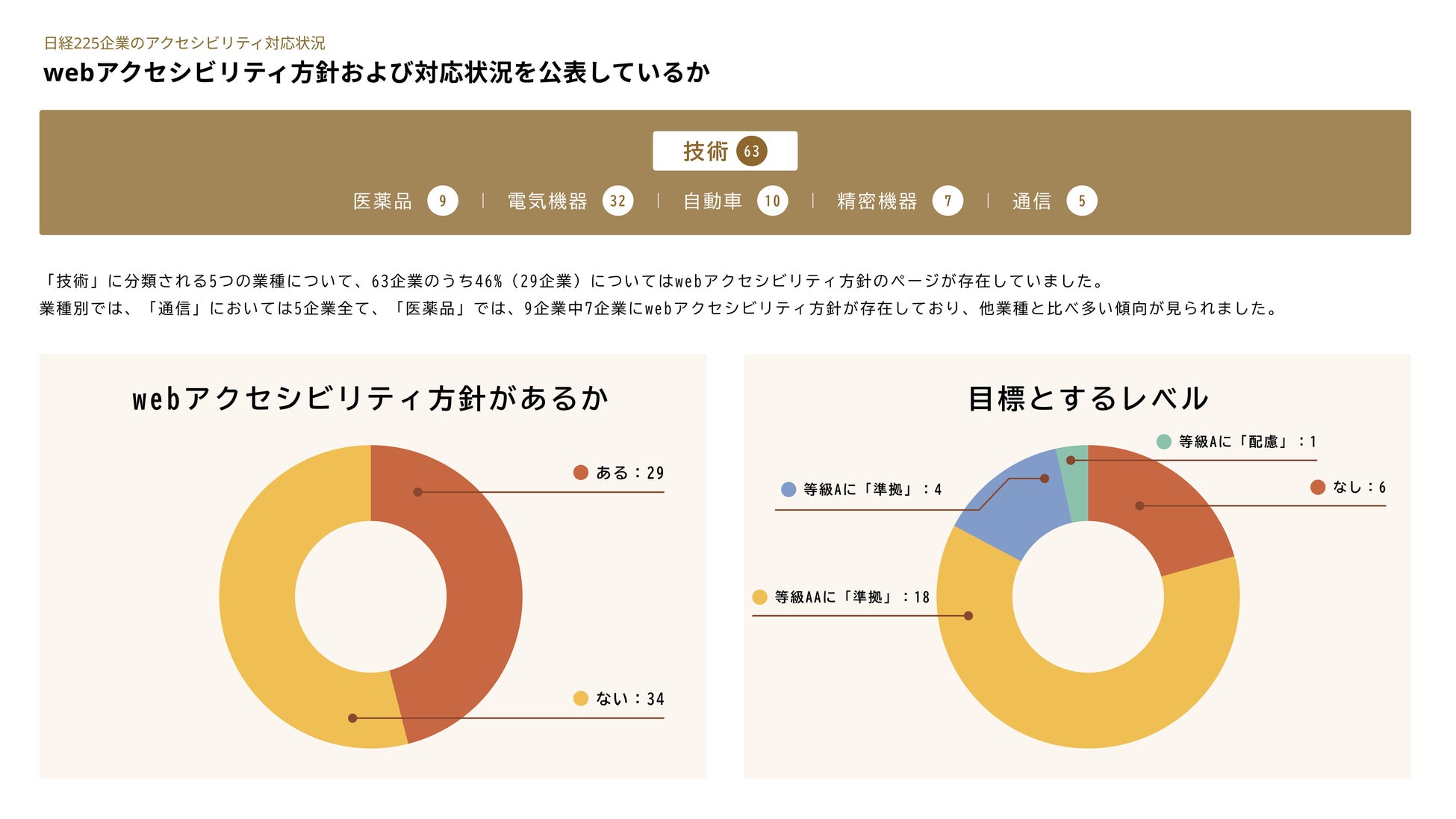 webアクセシビリティ方針ページの存在を調査した結果、技術に分類される「医薬品」「電気機器」「自動車」「精密機器」「通信」では46%(企業数63のうち29社)の企業が対応済みとなってました。また目標とするレベルについては約20%(企業数29のうち6社)の企業が「なし」という結果になりました。