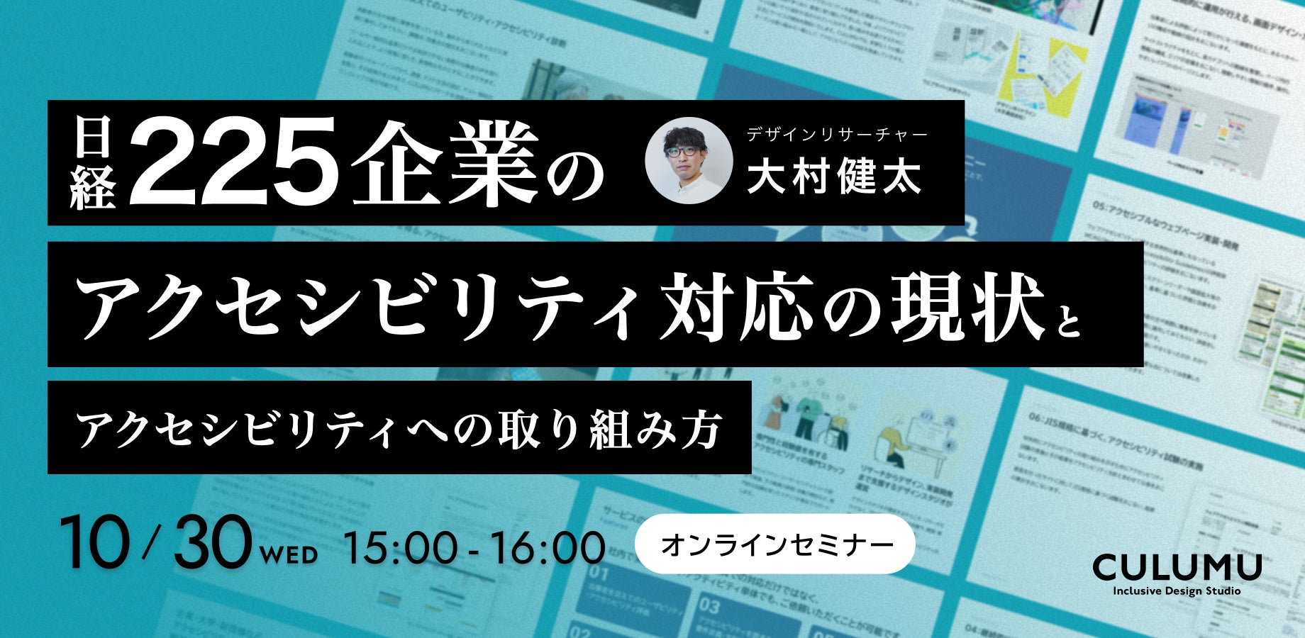 また2024年10月30日に調査レポートから得られたアクセシビリティ対応状況など、オンラインセミナーで解説いたします。加えてデザインスタジオCULUMUでこれまで取り組んできたアクセシビリティ事例をもとに、アクセシブルなウェブサイトを実現するための取り組み方をご紹介します。参加方法は以下の「オンラインセミナーのお申し込みはこちら」からお願いします。