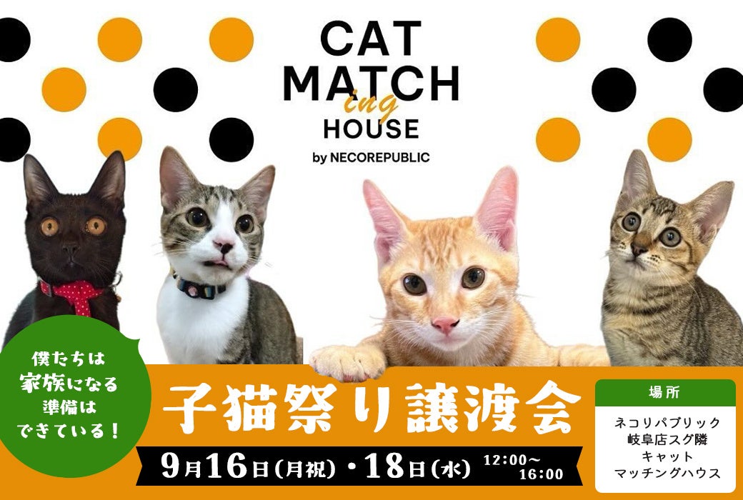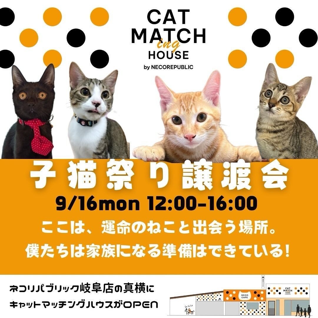 保護猫カフェ ネコリパブリック岐阜店の南隣に、保護猫との新たな出会いの場を作るスペースがオープン!その名は「キャットマッチングハウス」。9月16日(月)・18日(水)譲渡会を開催いたします。