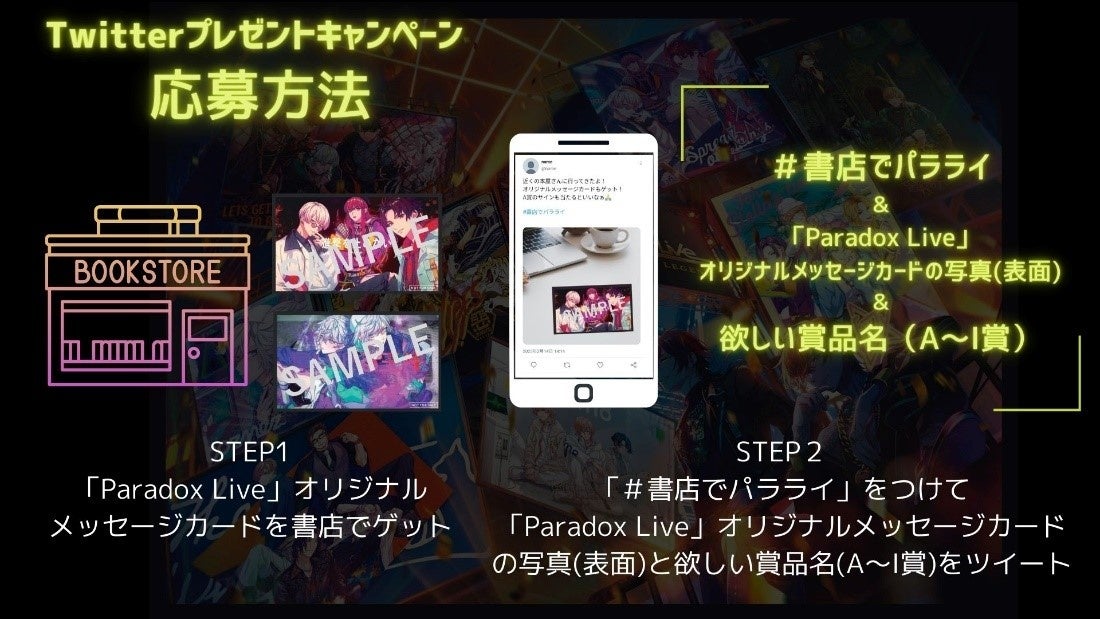 さらにキャンペーン期間中、入手したオリジナルメッセージカードの写真を、指定のハッシュタグとともにTwitterに投稿いただいたお客様を対象に、「Paradox Live」キャストのサイン入りノベルティや、ノベルティコンプリートセットが抽選で当たるTwitterプレゼントキャンペーンも実施いたします。