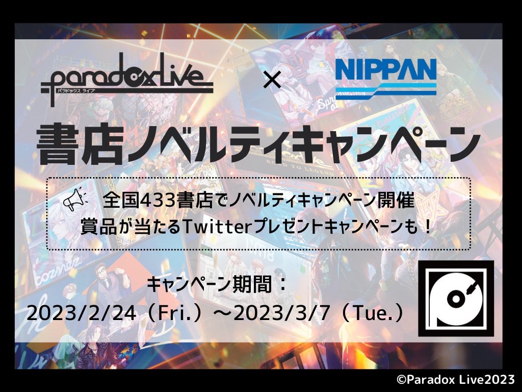 日本出版販売株式会社(代表取締役社長:奥村 景二、略称:日販)は、エイベックス・ピクチャーズ株式会社(代表取締役社長:勝股 英夫)と株式会社ジークレスト(代表取締役社長:大辻 純平)が展開するHIPHOPメディアミックスプロジェクト「Paradox Live」とコラボレーションし、2023年2月24日(金)より全国の書店433店舗にて、商品購入時に「Paradox Live」のオリジナルメッセージカードがもらえるノベルティキャンペーンを開始します。