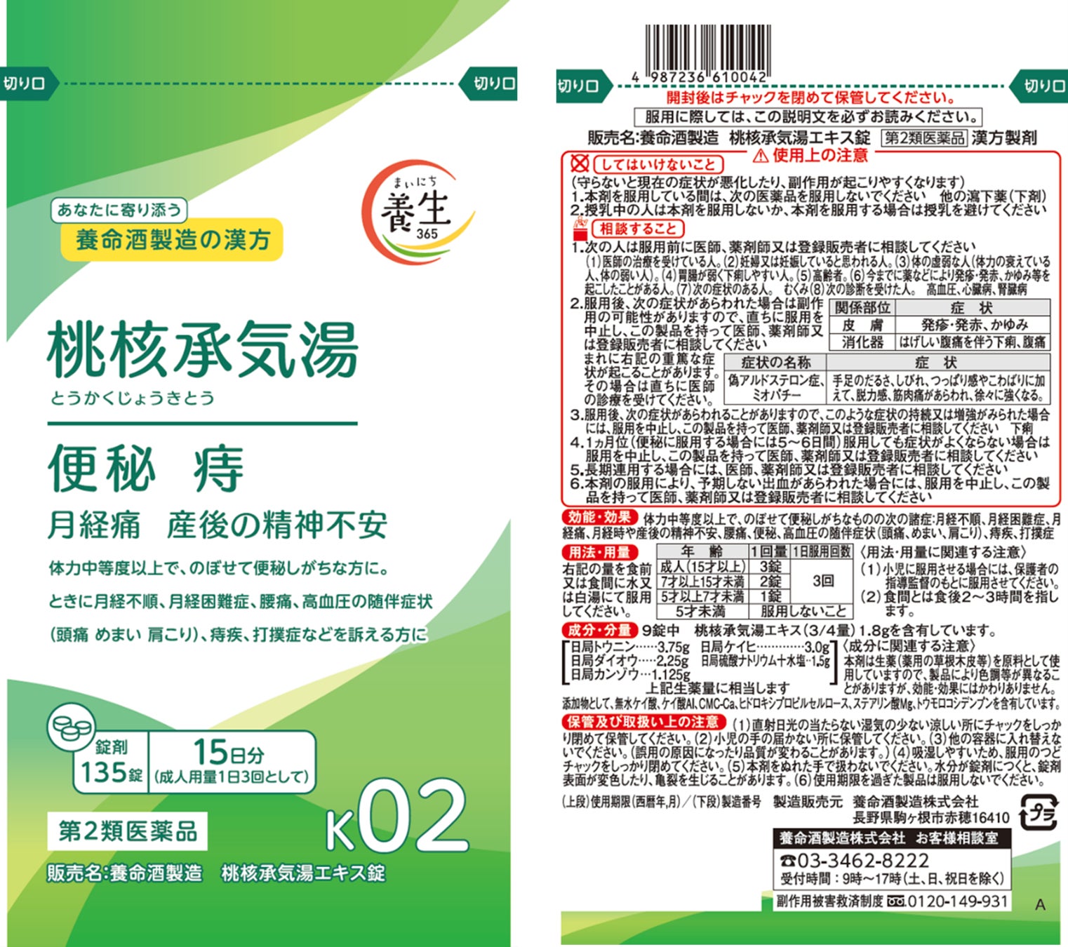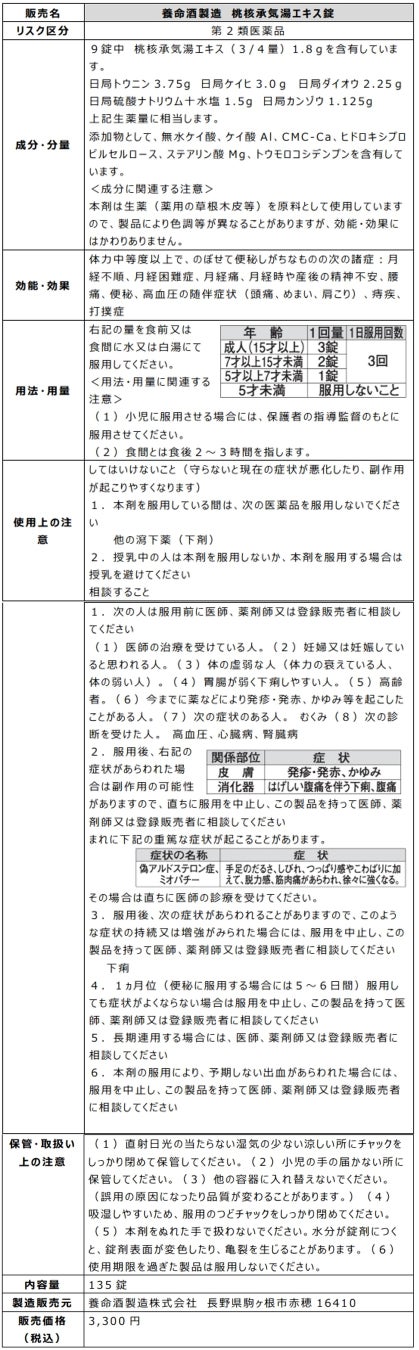 養命酒製造株式会社(本店:東京都渋谷区 代表取締役社長COO 田中 英雄)は、自社通信販売のYomeishuオンラインショップにて、漢方製剤の第2弾として、「養命酒製造 桃核承気湯エキス錠」を、2024年9月30日から新発売いたします。本品は、昨年9月に上市した女性のための漢方薬「養命酒製造 当帰芍薬散料エキス錠」に続く、養命酒製造 漢方製剤シリーズの商品です。