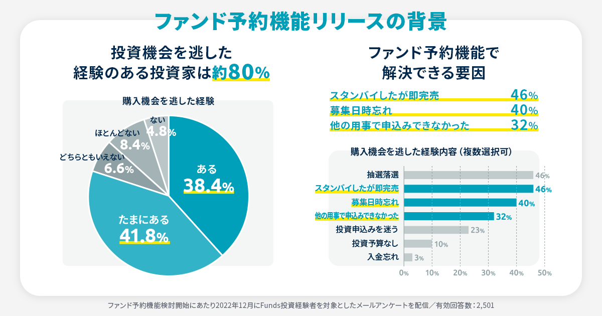 Fundsではこれまで、人気のファンドが公開後数分で満額になってしまうことや、ファンド募集開始のタイミングを逃す等で、一部の投資家から「投資したいファンドへの投資の申込ができなかった」というお声をいただいておりました。投資家の皆さまには日常生活で多忙の中、サイトにログインした状態でファンド公開のタイミングを待つ等のご不便をおかけすることもあり、解決すべき課題として認識をしておりました。