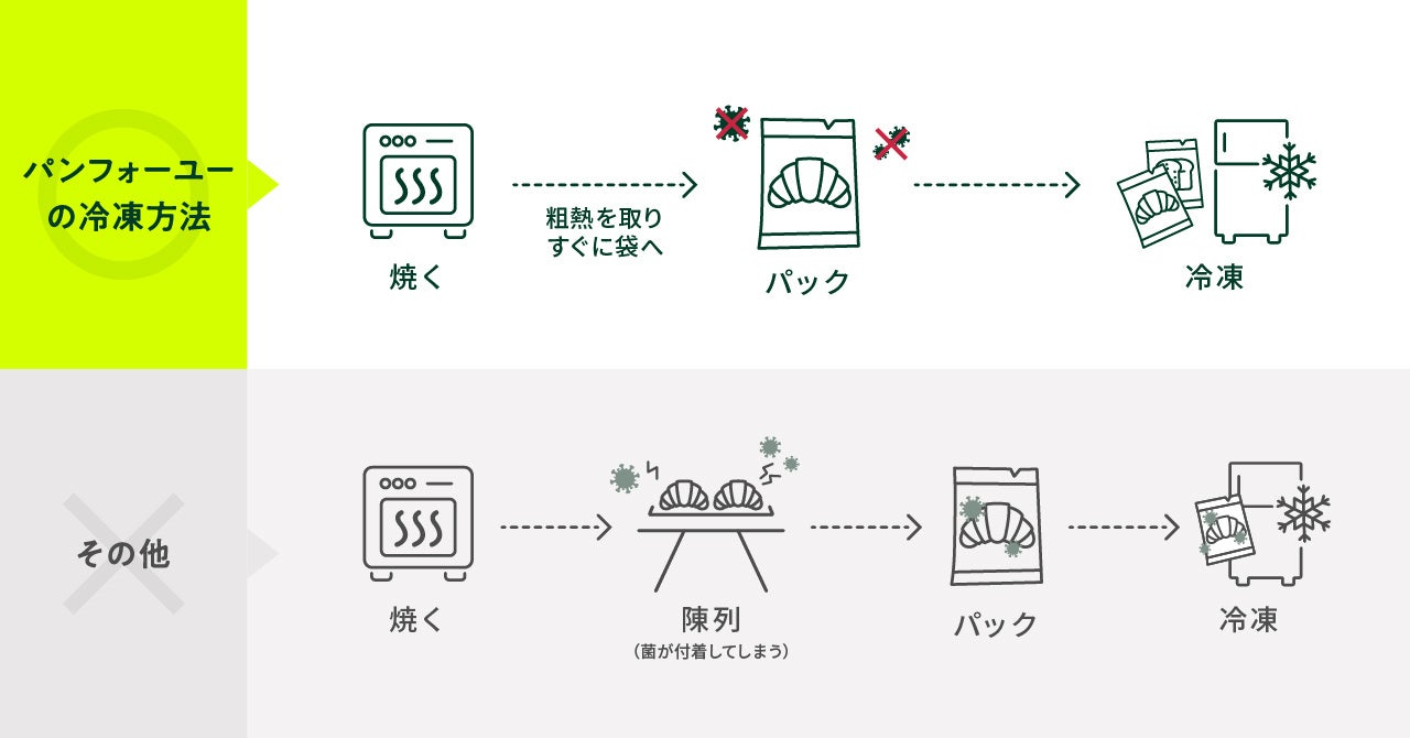 パンフォーユーの冷凍技術の特徴は特許取得済みの「パン冷凍保存袋」と「冷凍するタイミング」にあります。パン冷凍保存袋を活用し焼成後粗熱を取ったらすぐにパックすることにより、外気に触れる時間が短くなり細菌の付着を軽減。美味しく安全に冷凍することができます。