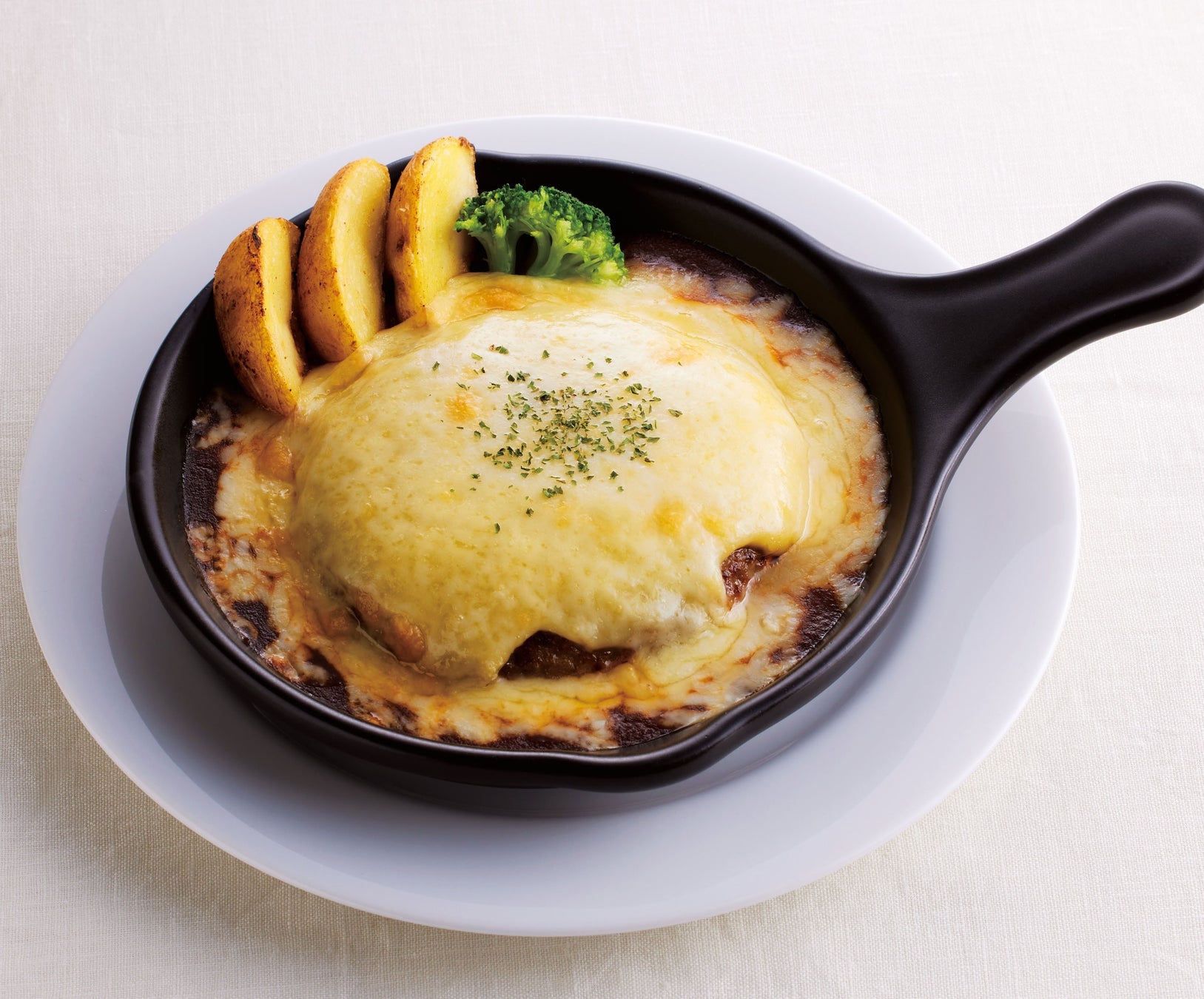 チーズソースが中に入ったハンバーグにさらにチーズをトッピングし、さらにコク深いデミグラスソースと焼き上げました。