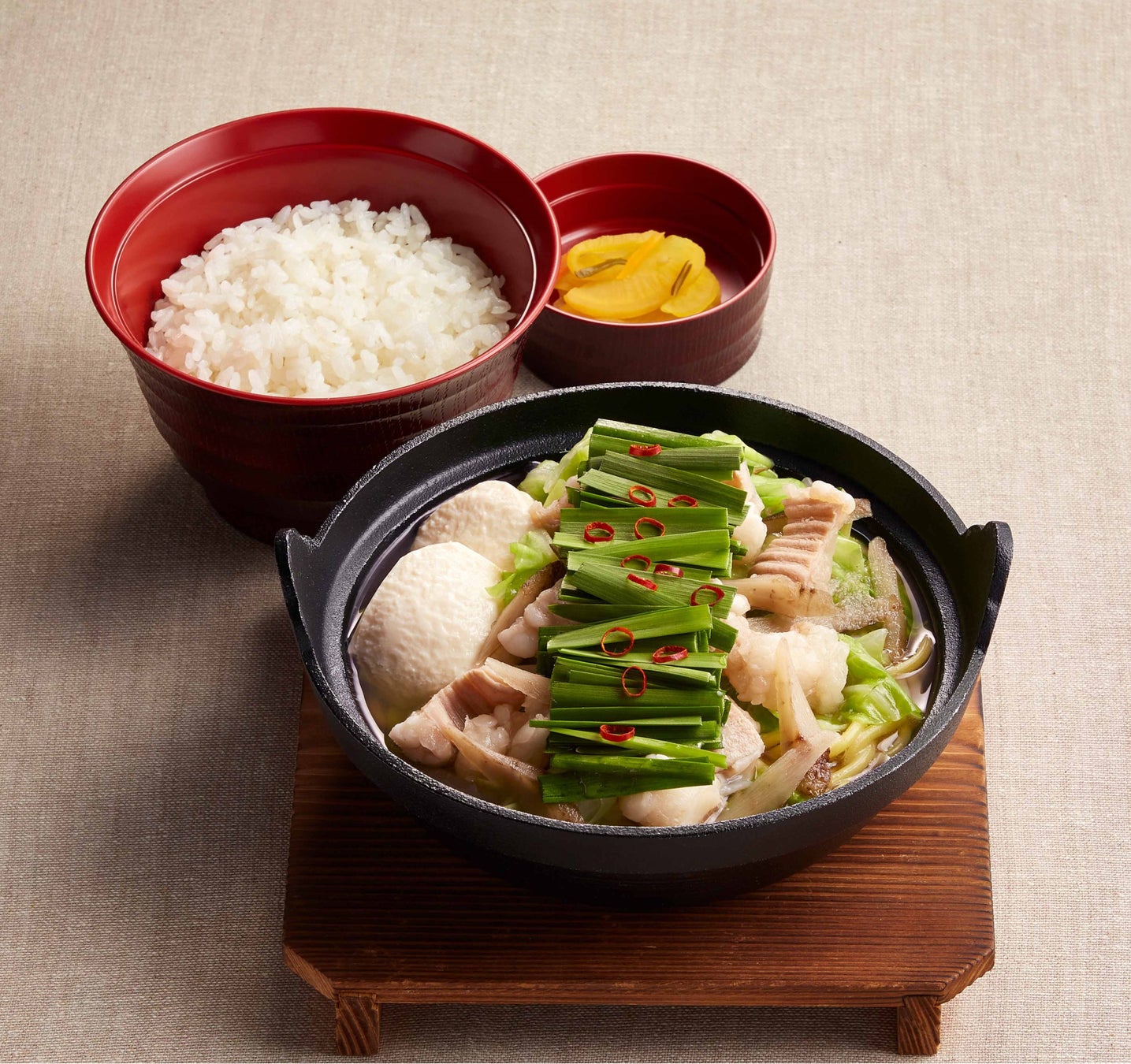 定食」や、ぷりぷりのモツと、あっさりした醤油スープで仕上げた「博多もつ鍋定食」など熱々の
