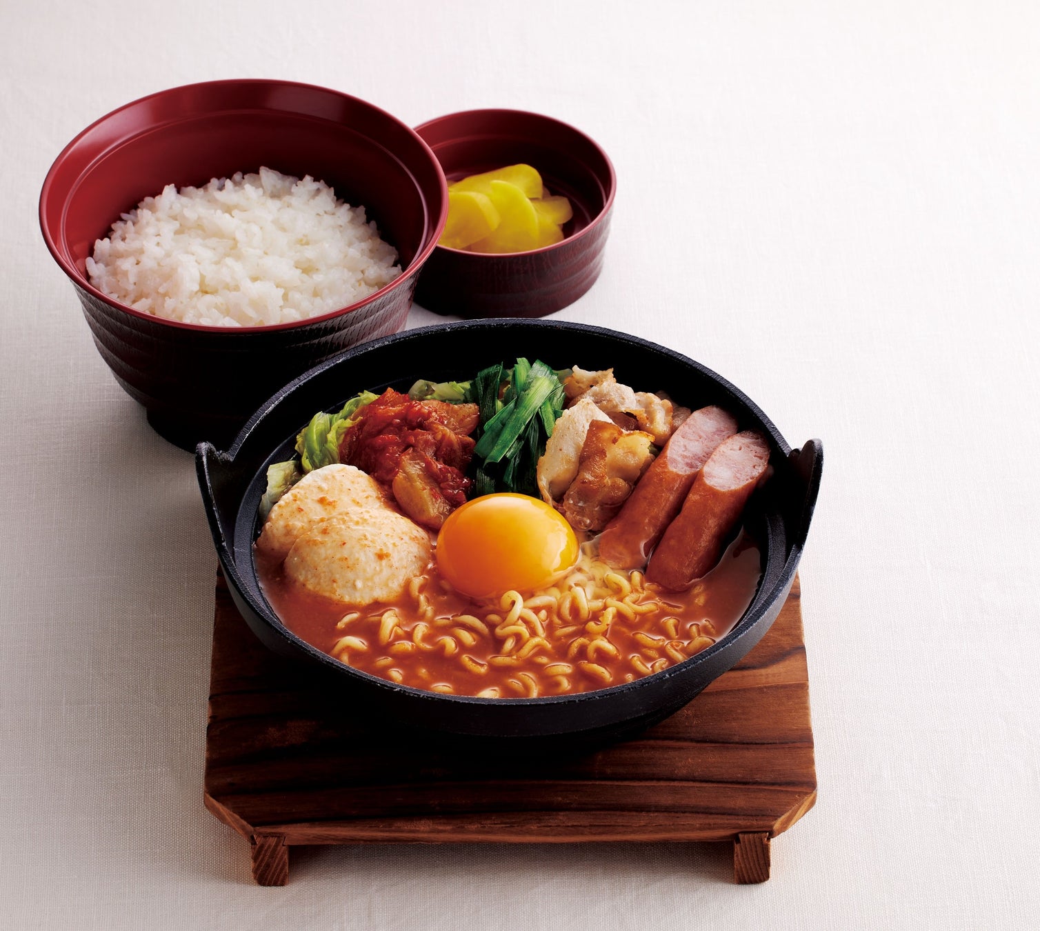 味噌をベースとした旨辛スープに、豚肉やソーセージ、野菜の旨味が溶け合った「旨辛スープのキムチチゲ