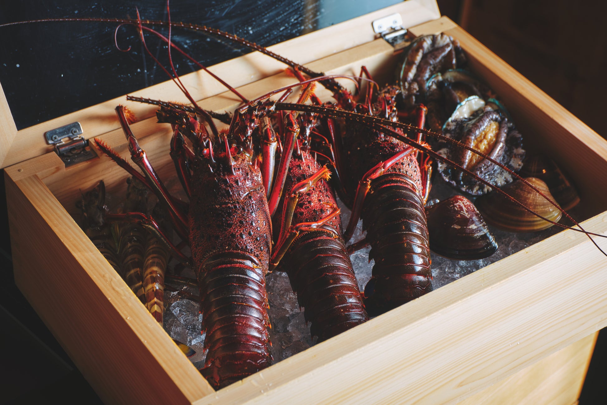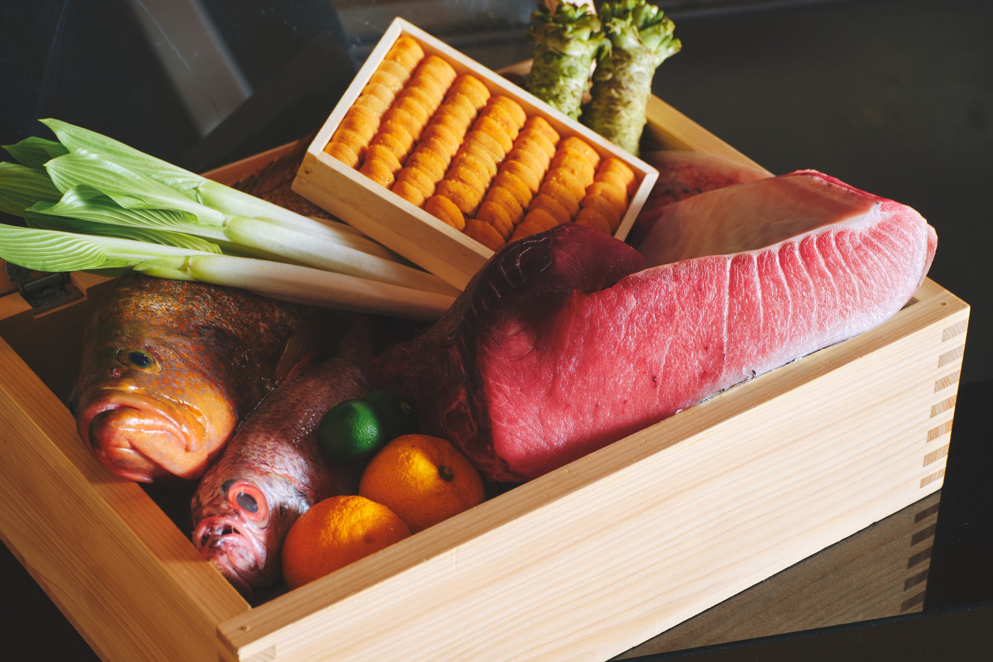 本メニューは、肉料理と魚料理を交互に楽しめるよう構成されており、シェフたちが幾度もの試作を重ねて完成させた自信作です。コースのお料理は、西日本三大和牛のひとつである近江牛の炙りサーロイン肉寿司に、長崎県産からすみの鮮やかな彩りを添えた一品から始まります。続いて、本マグロの赤身・中トロ・大トロを、それぞれ柚子、山椒、辛味大根といった趣の異なる薬味で味わっていただきます。さらに、塩漬けし乾燥させて仕上げた神戸牛のブレザオラ(生ハム)を、同じ「蔵」の名を冠した小豆島産のエキストラヴァージンオリーブオイルとともにお楽しみください。その後は、天然の赤鮑をお造りと鉄板焼、三重県産の活け伊勢海老を、鉄板焼と天婦羅という、それぞれ二つの異なる調理方法でご提供いたします。