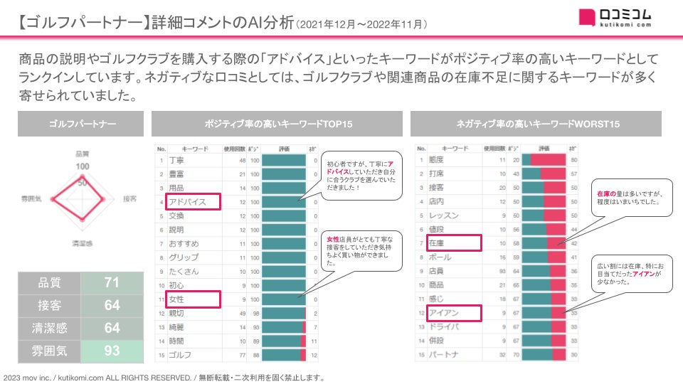 商品の説明やゴルフクラブを購入する際の「アドバイス」といったキーワードがポジティブ率の高いキーワードとしてランクインしています。ネガティブな口コミとしては、ゴルフクラブや関連商品の在庫不足に関するキーワードが多く寄せられていました。