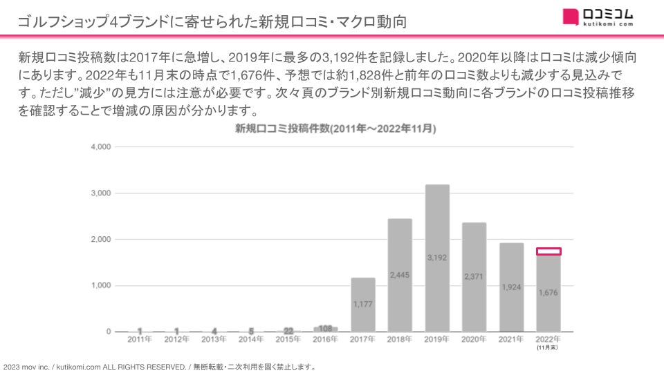 新規口コミ投稿数は2017年に急増し、2019年に最多の3,192件を記録しました。2020年以降は口コミは減少傾向にあります。2022年も11月末の時点で1,676件、予想では約1,828件と前年の口コミ数よりも減少する見込みです。ただし”減少”の見方には注意が必要です。この口コミ減少は、特定のブランドの急激な増減に影響されています。