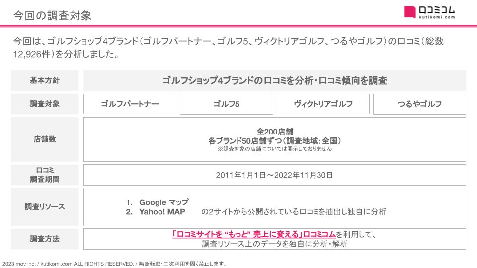 今回は、ゴルフショップ4ブランド(ゴルフパートナー・ゴルフ5・ヴィクトリアゴルフ・つるやゴルフ)の口コミ(総数12,926件)を分析しました。