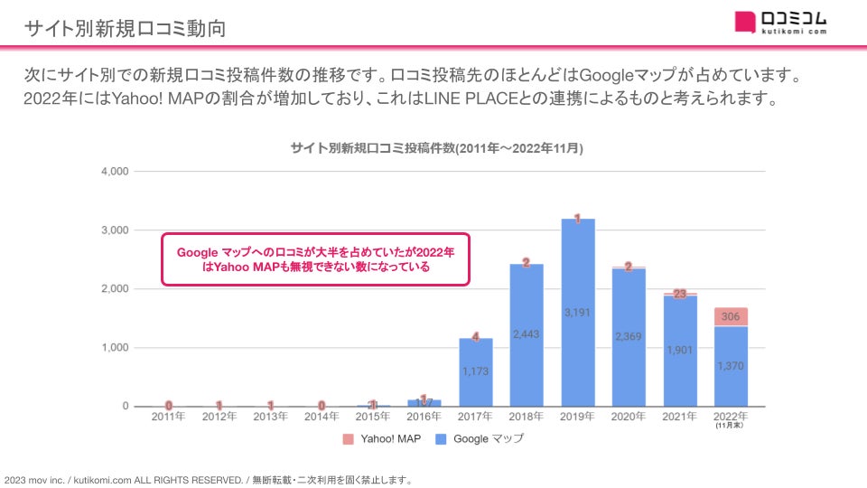 次にサイト別での新規口コミ投稿件数の推移です。口コミ投稿先のほとんどはGoogleマップが占めています。2022年にはYahoo! MAPの割合が増加しており、これはLINE PLACEとの連携によるものと考えられます。